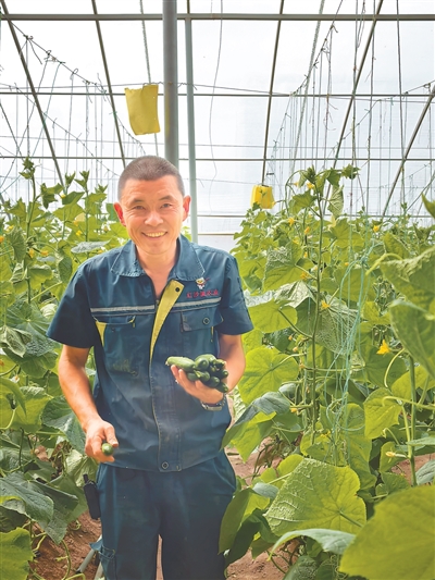 王孔会在蔬菜大棚里展示种植的黄瓜。